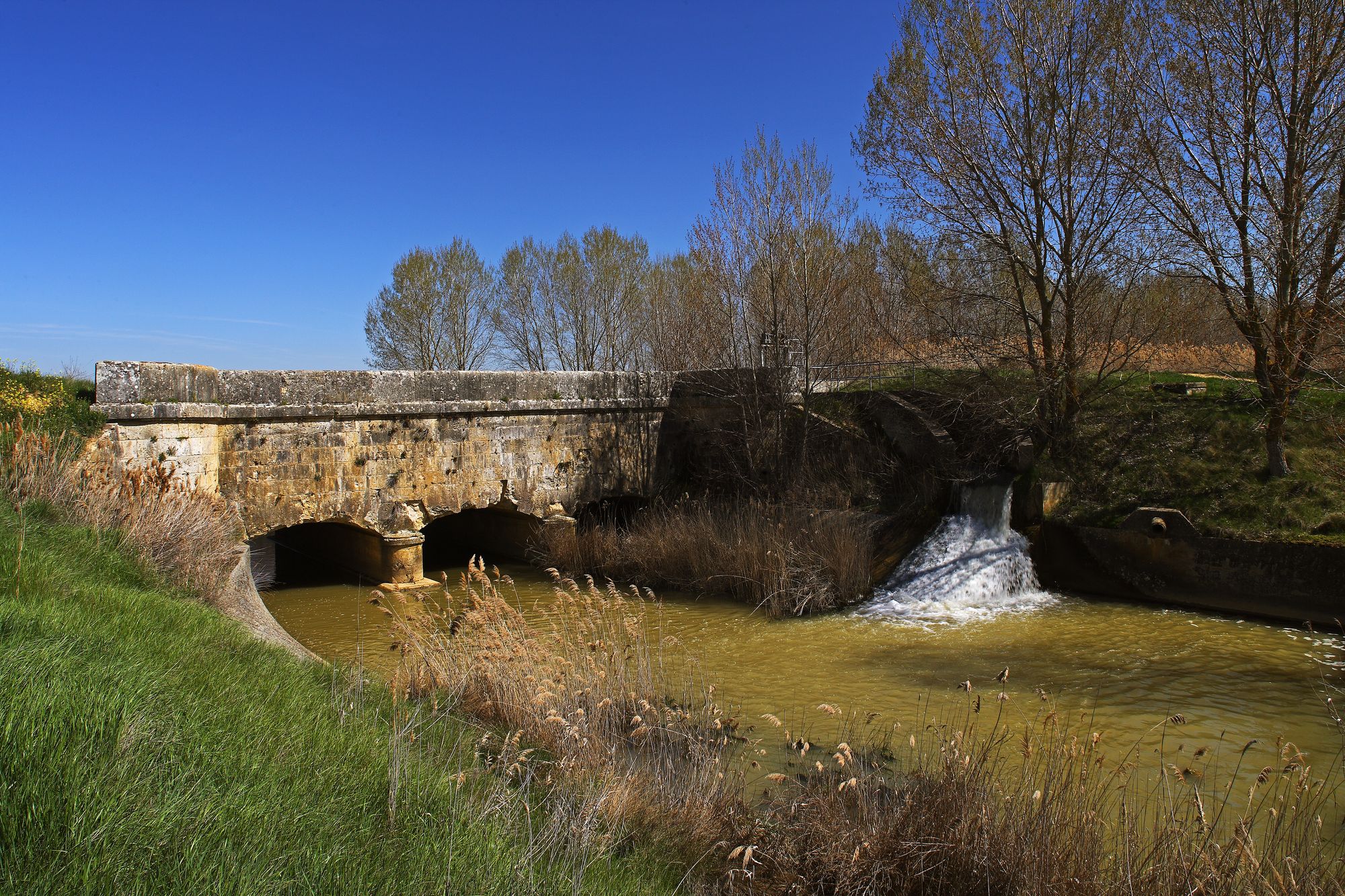 Along the Canal, tourists find numerous bridges and a total of sixty-nine aqueducts, of varying size and length, as the Vallarna aqueduct or the aqueduct of Ucieza River, through which the barges navigated (at one time the number of barges managed to exceed 300) to transport merchandises along the Canal. On the other hand, dams and retentions were those that adjusted the bed of the Canal when it reached the Pisuerga and the Carrion Rivers.