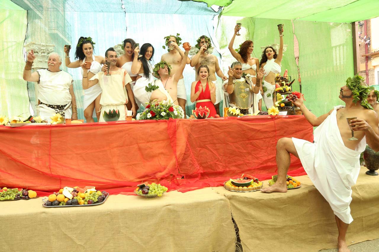 Cabe destacar la comida que compartimos unas 650 personas durante la que se disfruta de un espectáculo de bacanal. Además podremos presenciar representaciones de teatro, desfile de legiones, lucha de gladiadores, aves rapaces, participar en la Baco Race, etc.