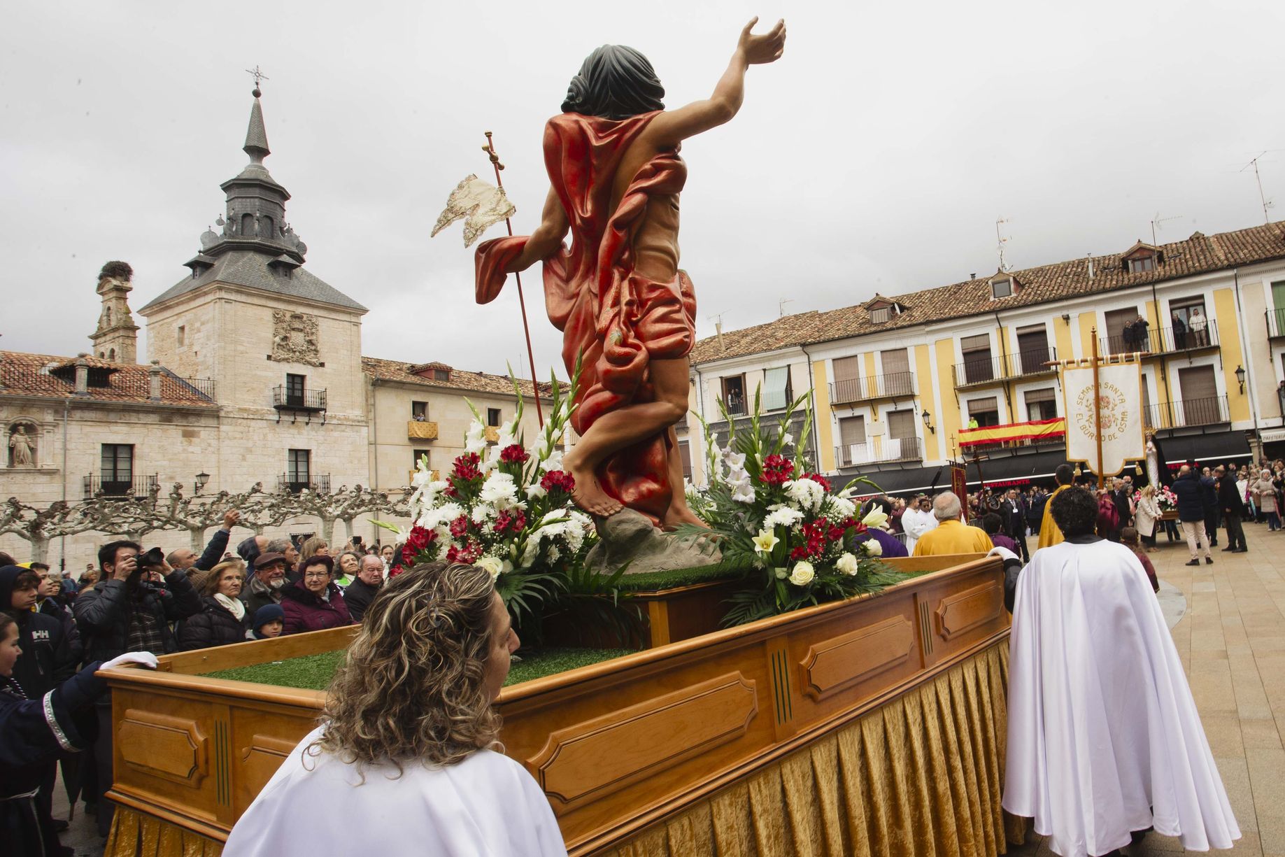 Out of the many villages that celebrate Semana Santa (Holy Week) with processions and liturgical events, one festival that stands out is that of El Burgo de Osma. The village is an Episcopal seat, and its festival presents diferent floats, which form daily processions. One in particular is a 16th century float of el Cristo Resucitado (Christ resurrected), copy of an original designed by Juan de Juni.