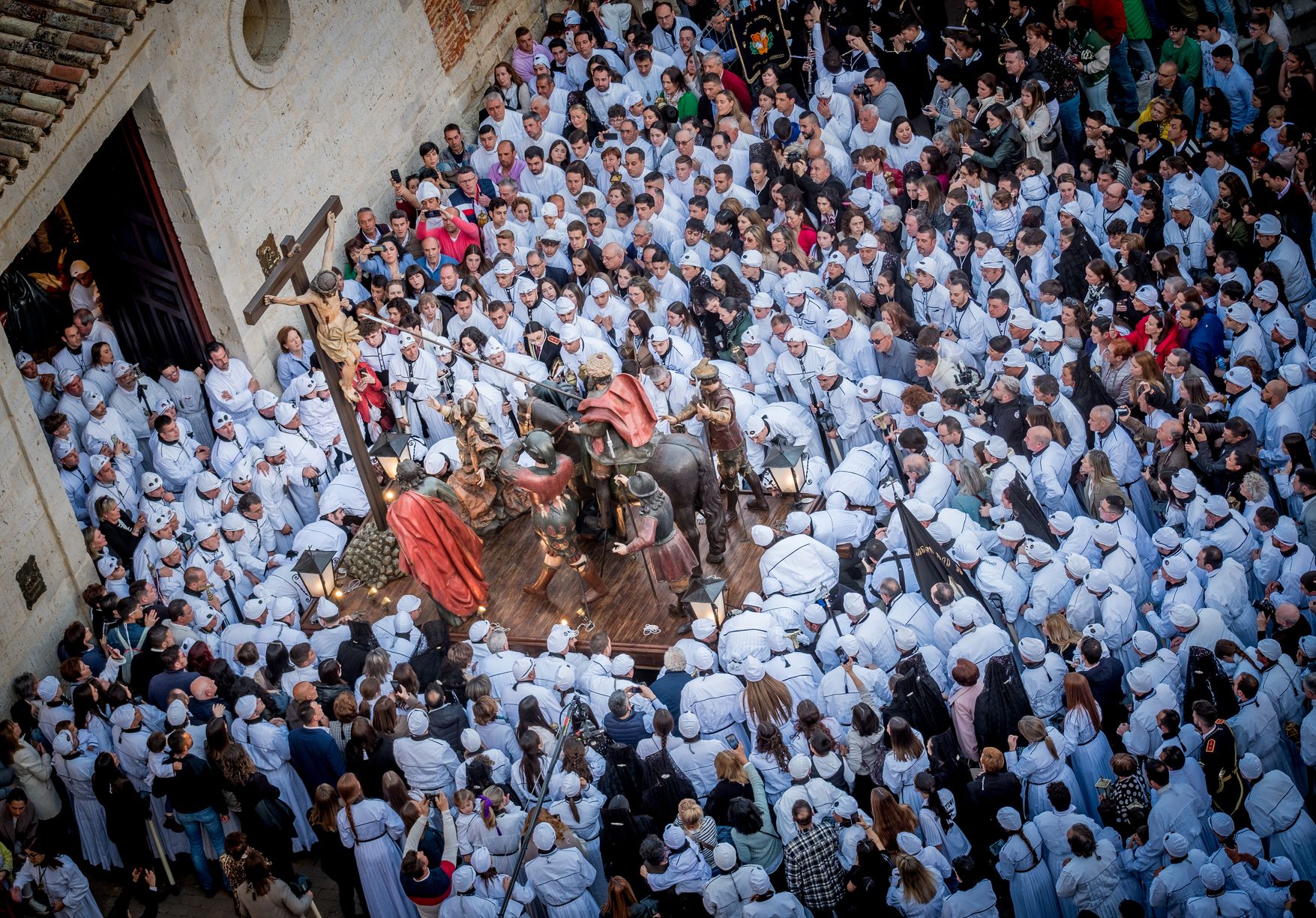 All the floats are carried on the brothers' shoulders through the old narrow village streets. Particularly impressive is the procession called Pasos Grandes (big floats), known locally as El Longinos and La Escalera, which corresponds with the floats of La Crucifixión (the crucifixion) and El Descendimiento (the descent from the cross).
