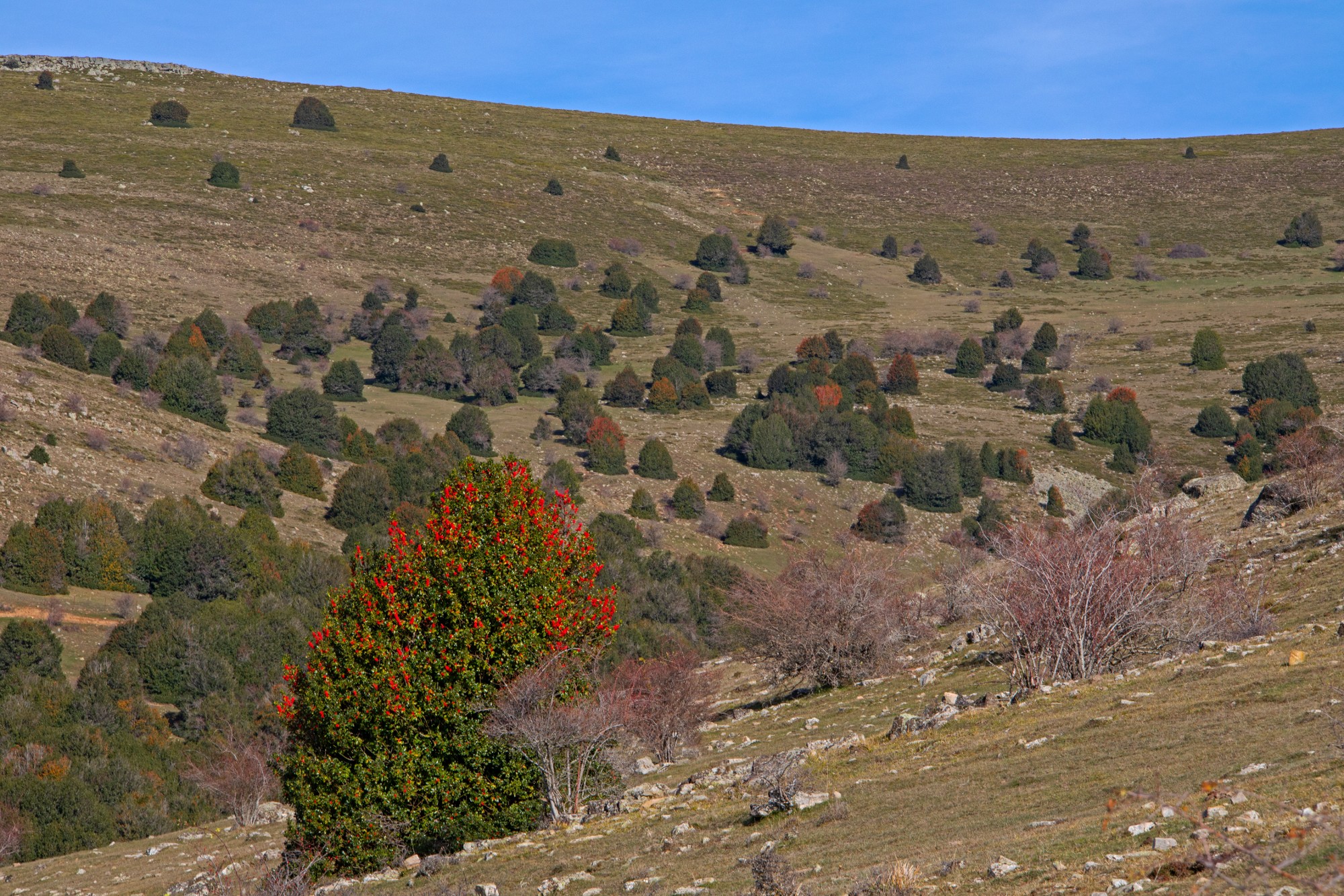 Descubre el Acebal de Garagüeta en el norte de Soria, un rincón mágico con una belleza natural excepcional. Durante el otoño, el acebo se tiñe de rojo y dorado, transformándose en un cuento de hadas. Además de su esplendor estacional, el Acebal conserva la tradición de utilizar el acebo para adornos navideños, todo mientras se aplican prácticas de cuidado forestal sostenible.