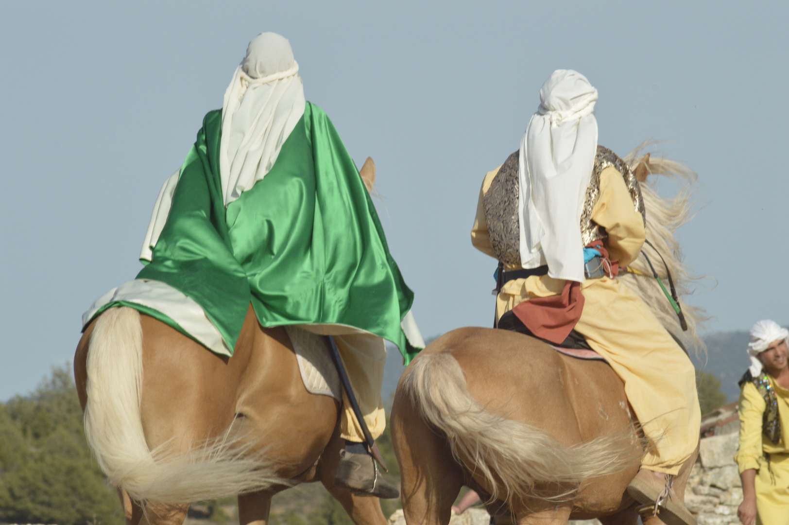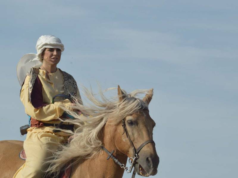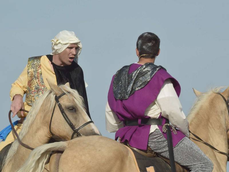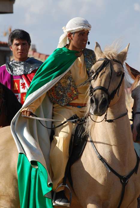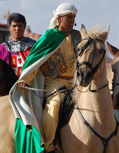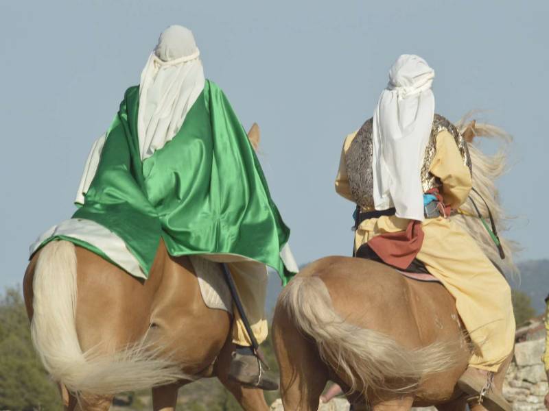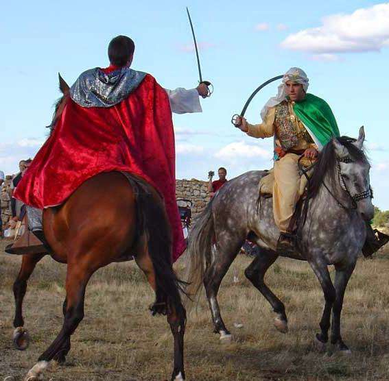 Consiste en el simulacro de una batalla a caballo en la que cuatro moros se baten contra cuatro cristianos por la conquista de la imagen del pueblo, la Virgen de la Cabeza. Durante el enfrentamiento, los actores recitan un texto de contenido religioso, que culminará con la aparición del ángel que convertirá al cristianismo a uno de los últimos traidores.