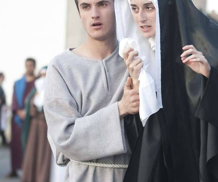 The inhabitants of the municipality embody different characters from the Bible, giving life to scenes as dramatic as the crying and expression of rage of a mother at the death and pain of her son who is subjected to all kinds of harassment by the soldiers. Romans to exhaustion; the kindness of a woman who approaches him to dry his wounds and quench his thirst; the cruelty of the Roman soldiers whipping him tied to a column; Pontius Pilate, washing his hands and not wanting to know anything about the crime that is going to be committed; or the falls that Jesus suffers due to exhaustion when dragging a heavy cross-shaped piece of wood on which he will be crucified.
